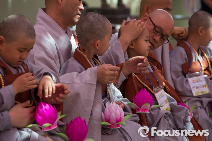 (서울=포커스뉴스) 2일 오전 서울 종로구 조계사 대웅전 앞마당에서 열린 동자승 단기출가 보리수 새싹학교 삭발, 수계식에서 동자승들이 스님과 기념촬영을 하고 있다.