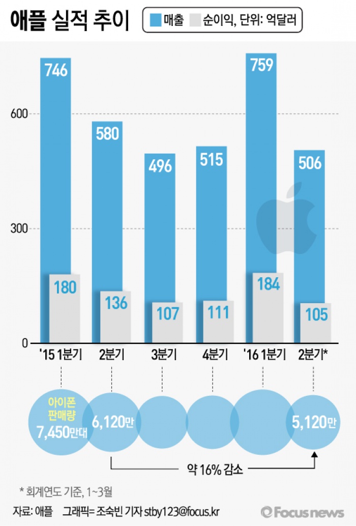 애플은 26일(현지시간) 2016 회계연도 2분기(1~3월) 매출이 전년도 1분기 대비 13% 떨어진 506억달러(약 59조1394억원)이라고 발표했다. 순이익은 22% 감소한 105억달러(약 12조645억원)였다.