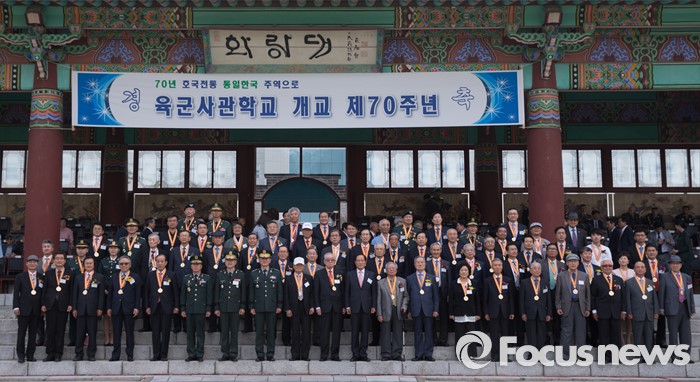 (서울=포커스뉴스) 29일 오후 서울 노원구 육군사관학교에서 열린 개교 70주년 기념식에서 최병로 육군사관학교장을 비롯한 아름다운 육사인 70인이 기념촬영 하고 있다.