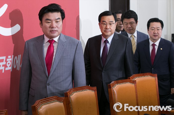 (서울=포커스뉴스) 원유철(왼쪽) 새누리당 대표최고위원 권한대행과 김정훈(왼쪽 두번째) 정책위의장을 비롯한 의원들이 28일 오전 서울 여의도 국회에서 열린 대북 관련 긴급 안보 대책회의에 참석하고 있다.