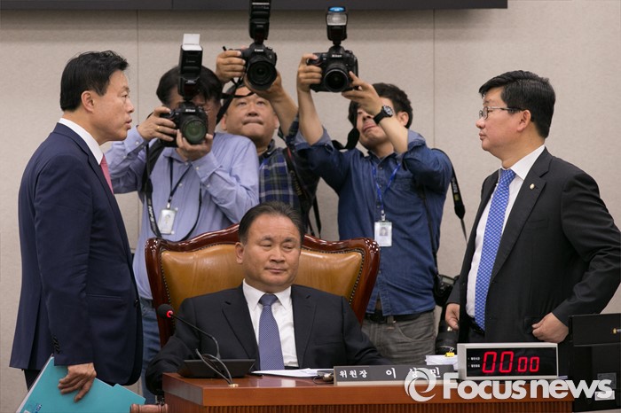 (서울=포커스뉴스) 이상민(가운데) 법사위원장과 이한성(왼쪽) 여당 간사, 전해철 야당 간사가28일 오후 서울 여의도 국회 법제사법위원회 전체회의장에서 논의하고 있다.