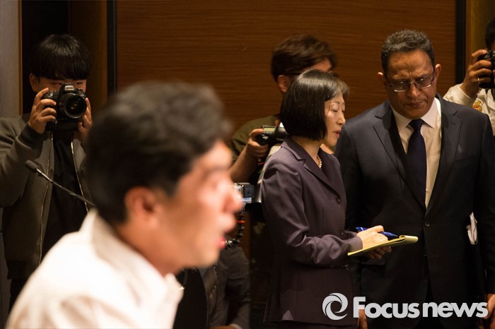 (서울=포커스뉴스) 2일 오전 서울 영등포구 콘래드호텔에서 열린 옥시레킷벤키저 기자회견에 참석한 가습기살균제피해자유가족연대 최승운 대표가 아타 샤프달 옥시 한국법인장의 입장표명을 거부하는 발언을 하고 있다.
