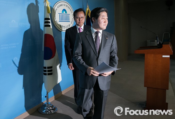 (서울=포커스뉴스) 유기준(오른쪽) 새누리당 의원이 28일 오후 서울 여의도 국회 정론관에서 정책위의장 러닝메이트 후보인 이명수 의원과 원내대표 출마 기자회견을 마친 뒤 퇴장하고 있다.