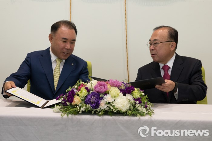 (서울=포커스뉴스) 25일 오전 서울 관악구 서울대학교 수의과대학 생명공학 연구동에서 열린 서울대-BBQ 공동연구 조인식에 윤홍근(왼쪽) 제너시스비비큐 그룹 회장과 박용호 서울대 수의과대학 교수가 협약서에 사인을 하고 있다.