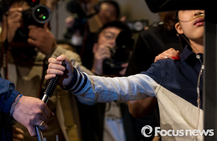 (서울=포커스뉴스) 2일 오전 서울 영등포구 콘래드호텔에서 열린 '옥시레킷벤키저(현 RB코리아) 가습기 살균제 파동' 관련 기자회견에서 피해자 임성준 군이 산소통을 붙들고 있다.