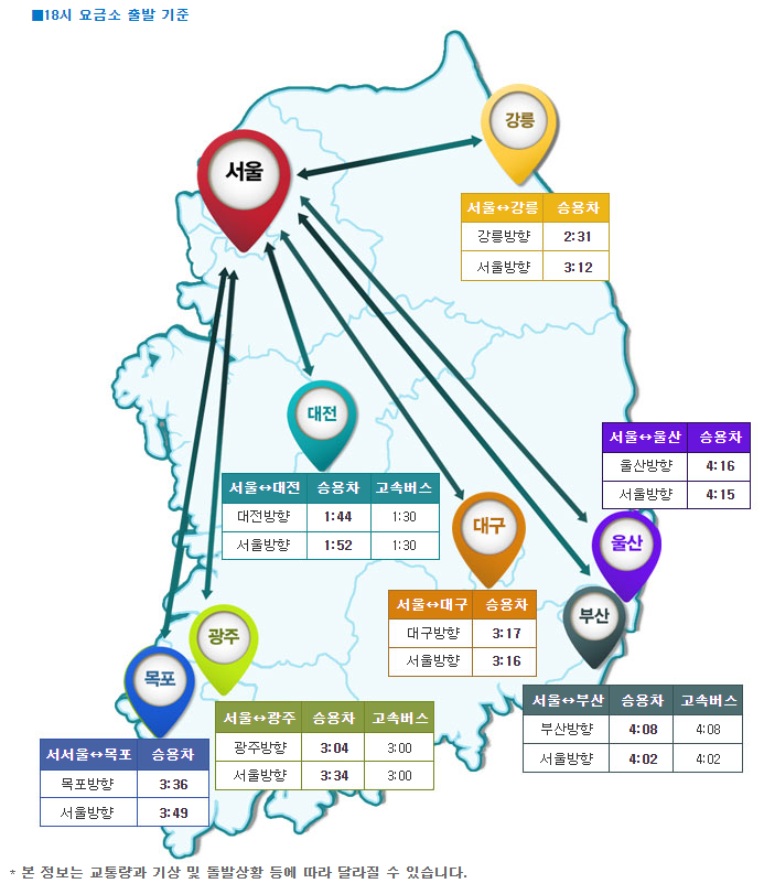 주요 도시에서 서울까지 소요되는 시간은 오후 6시 기준 강릉 3시간 12분, 부산 4시간 2분, 광주 3시간 34분, 목포 3시간 49분, 대전 1시간 52분 등이다.