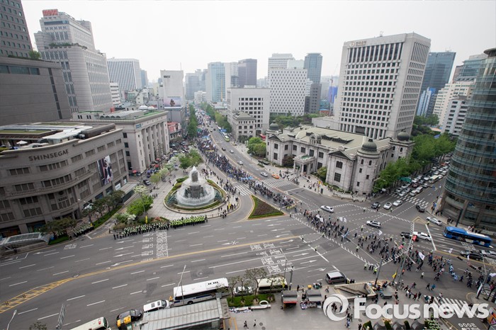 (서울=포커스뉴스) 30일 오후 서울역 광장에서 민주노총 공공운수 전국철도노동조합 회원들이 '철도노동자 1차 총력 결의대회'를 마치고 시내를 행진하고 있다.