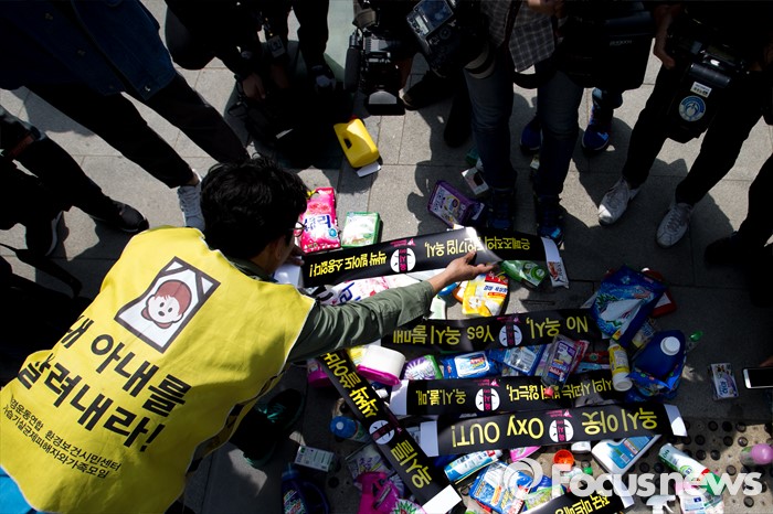 (서울=포커스뉴스) 25일 오전 서울 종로구 광화문 광장에서 옥시 가습기 살균제 피해 가족 및 환경단체 관계자들이 옥시 상품 불매를 촉구하는 퍼포먼스를 펼치고 있다.