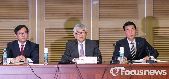 (서울=포커스뉴스) 최장집(가운데) 고려대 명예교수가 25일 오후 서울 여의도 국회 의원회관에서 새누리당 혁신모임 외부인사 간담회에 초청되어 강연을 하고 있다.