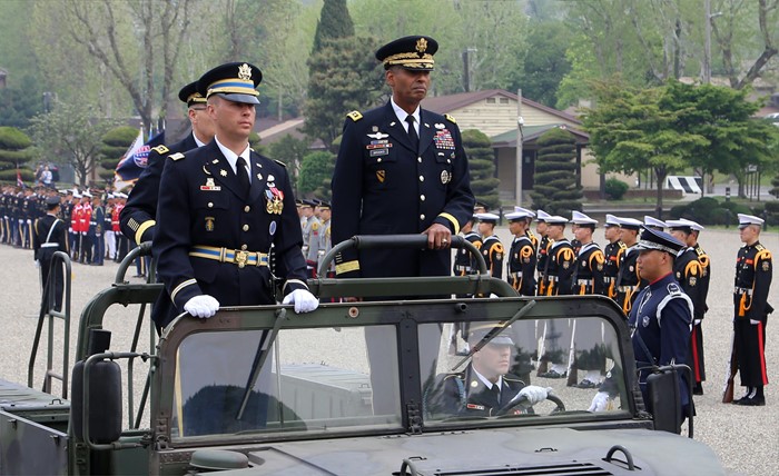 (서울=포커스뉴스) 빈센트 브룩스 신임 한·미연합사령관 겸 주한미군사령관이 30일 서울 용산기지 나이트필드에서 열린 이취임식에서 커티스 스카파로티 현 사령관과 의장대를 열병하고 있다. <사진제공=주한미군 홈페이지>