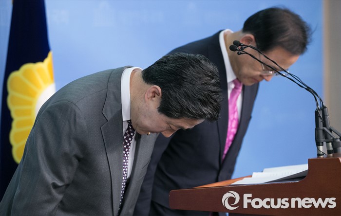 (서울=포커스뉴스) 유기준(왼쪽) 새누리당 의원이 28일 오후 서울 여의도 국회 정론관에서 정책위의장 러닝메이트 후보인 이명수 의원과 원내대표 출마 기자회견을 마친 뒤 인사하고 있다.