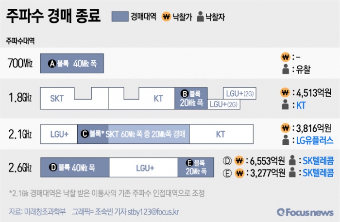 입찰가는 B블록을 KT가 4513억원으로 가져갔고, C블록은 LG유플러스가 3816억원으로, D와 E블록은 SK텔레콤이 40㎒폭을 9500억원으로, 20㎒폭은 3277억원으로 가져갔다. SK텔레콤만 최저 입찰가보다 3000억 가량 높게 가져갔을 뿐 다른 두 이통사는 최저가격에 주파수를 따냈다.