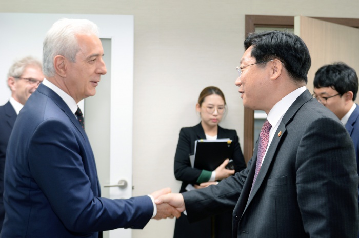 (서울=포커스뉴스) 주형환 산업통상자원부 장관이 25일 오후 서울 종로구 정부서울청사 집무실에서 스타니슬라우 루디 틸리히(Stanislaw Rudi Tillich) 독일 연방상원의장·작센주 총리 일행의 예방을 받고, 한-독일 작센주간의 경제협력과 에너지 저장 시스템(ESS) 관련 협력 및 전기차·지능형 교통시스템 등의 협력을 주제로 의견을 교환했다.<사진제공=산업통상자원부>