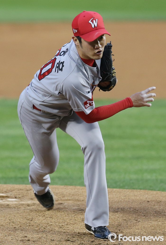 (서울=포커스뉴스) 27일 서울 잠실구장에서 열린 2016 프로야구 SK-두산 경기에서 1회말 SK 선발투수 박종훈이 투구하고 있다.