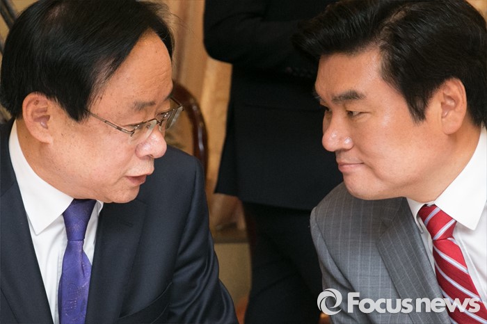 (서울=포커스뉴스) 원유철(왼쪽) 새누리당 원내대표와 이주영 의원이 25일 오후 서울 여의도의 한 중식당에서 열린 중진의원 오찬 간담회에 참석해 대화하고 있다.