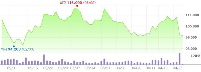 그는 "1분기 실적 부진을 감안해 이익 전망치와 목표주가를 하향 조정한다"며 목표주가를 종전 13만원에서 11만원으로 낮춰잡았다. 투자의견도 '매수'에서 '중립'으로 하향했다.최근 3개월간 현대위아 주가 추이 <그래픽출처=네이버>