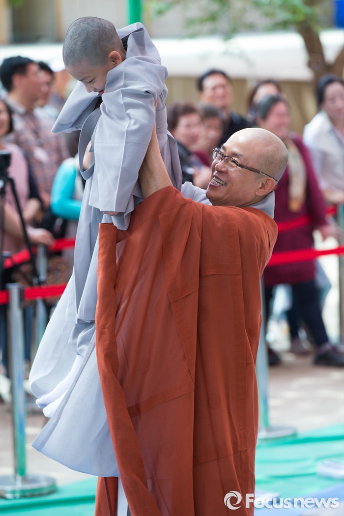 (서울=포커스뉴스) 2일 오전 서울 종로구 조계사 대웅전 앞마당에서 열린 동자승 단기출가 보리수 새싹학교 삭발, 수계식에서 삭발을 마친 동자승을 스님이 들어 올리고 있다.