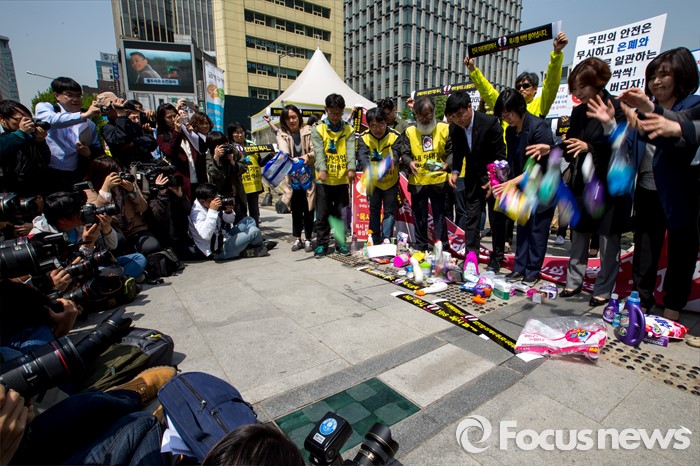 (서울=포커스뉴스) 25일 오전 서울 종로구 광화문 광장에서 옥시 가습기 살균제 피해 가족 및 환경단체 관계자들이 옥시 상품 불매를 촉구하는 퍼포먼스를 펼치고 있다.