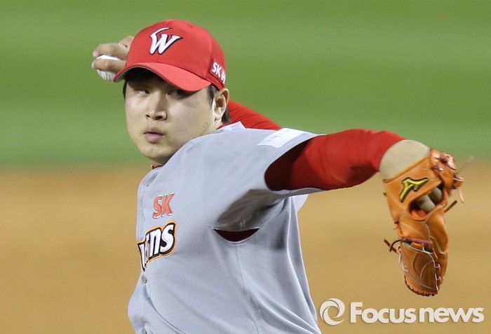 (서울=포커스뉴스) 27일 서울 잠실구장에서 열린 2016 프로야구 SK-두산 경기에서 SK 투수 박민호가 7회 2사후 마운드에 올라 투구하고 있다.