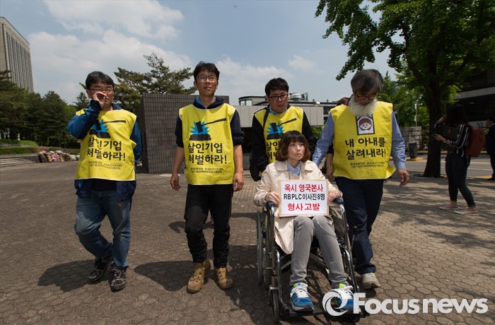 (서울=포커스뉴스) 2일 오후 서울 서초구 서울중앙지방검찰청에 가습기살균제 피해자와 가족모임과 환경보건시민센터 관계자들이 옥시레킷벤키저 대표 등 8명의 이사진을 형사고발 하기 위해 들어서고 있다.