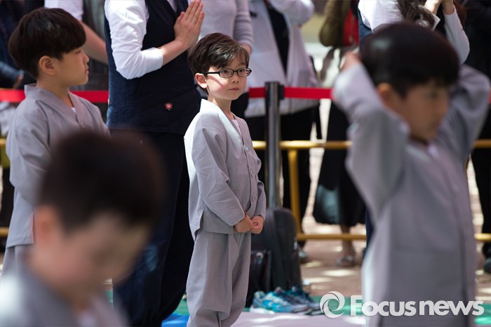(서울=포커스뉴스) 2일 오전 서울 종로구 조계사 대웅전 앞마당에서 열린 동자승 단기출가 보리수 새싹학교 삭발, 수계식에서 동자승들이 삭발을 준비하고 있다.