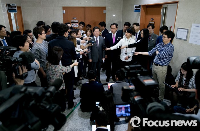 (서울=포커스뉴스) 유기준(왼쪽) 새누리당 의원이 28일 오후 서울 여의도 국회 정론관에서 정책위의장 러닝메이트 후보인 이명수 의원과 원내대표 출마 기자회견을 마친 뒤 취재진 질문에 답하고 있다.