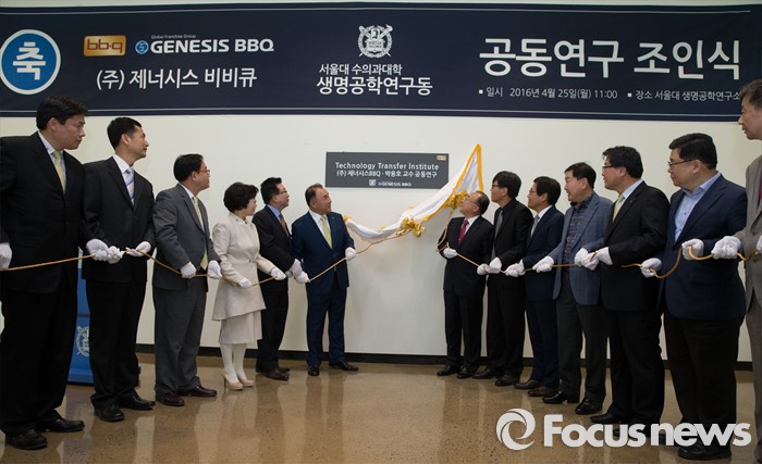 (서울=포커스뉴스) 25일 오전 서울 관악구 서울대학교 수의과대학 생명공학 연구동에서 열린 서울대-BBQ 공동연구 조인식에서 윤홍근(왼쪽 여섯번째) 제너시스비비큐 그룹 회장과 박용호 서울대 수의과대학 교수가 현판식을 하고 있다.