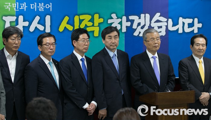 (광주=포커스뉴스) 김종인 더불어민주당 비대위 대표가 25일 오후 광주광역시의회 브리핑룸에서 광주 및 전남 언론사 기자간담회를 하고 있다. 왼쪽부터 이춘석, 정성호, 양승조 비대위원, 이종걸 원내대표, 김 대표, 정세균 의원.