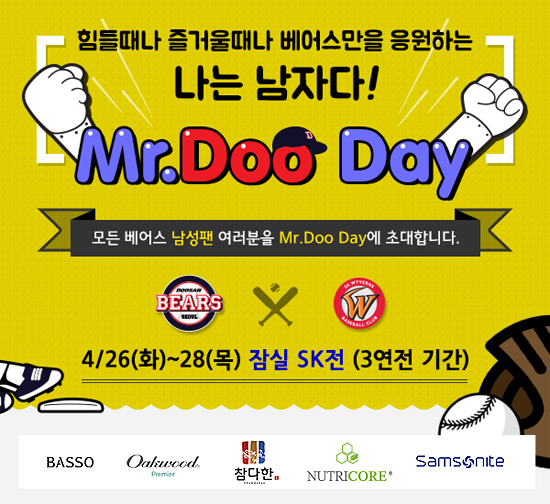 (서울=포커스뉴스) 프로야구 두산이 26일부터 28일까지 잠실구장에서 열리는 SK와의 3연전에 남성팬을 위한 '미스터 두데이(Mr.Doo Day)' 이벤트를 연다.