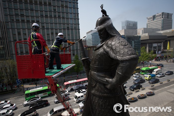 아울러 함차타보기, 수군복 입어보기 등 체험행사도 진행된다.18일 오전 서울 세종로사거리 광화문광장에서 서울시 관계자들이 이순신장군 동상 세척 및 보존 작업을 하고 있다. 2016.04.18 김흥구 기자