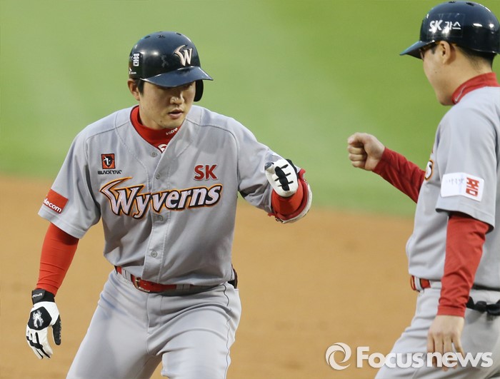 (서울=포커스뉴스) 26일 서울 잠실구장에서 열린 2016 프로야구 SK-두산 경기 2회초 1사 3루에서 SK 김성현이 1타점 중전안타를 치고 1루에서 박진만 코치와 주먹을 마주치고 있다.