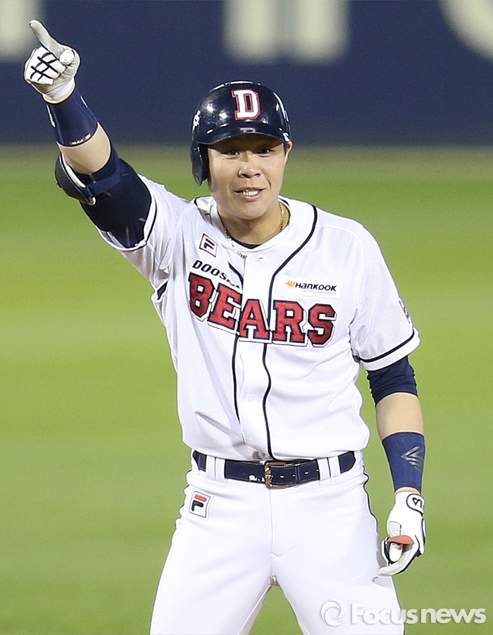 (서울=포커스뉴스) 26일 서울 잠실구장에서 열린 2016 프로야구 SK-두산 경기 6회말 무사 만루에서 두산 대타 박세혁이 2타점 우익수 오른쪽에 떨어지는 2루타를 치고 2루에서 환호하고 있다.