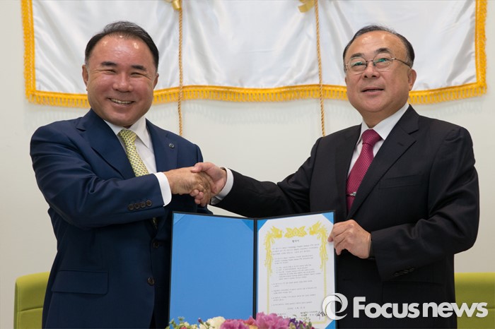 (서울=포커스뉴스) 25일 오전 서울 관악구 서울대학교 수의과대학 생명공학 연구동에서 열린 서울대-BBQ 공동연구 조인식에 윤홍근(왼쪽) 제너시스비비큐 그룹 회장과 박용호 서울대 수의과대학 교수가 협약서를 들고 기념촬영하고 있다.