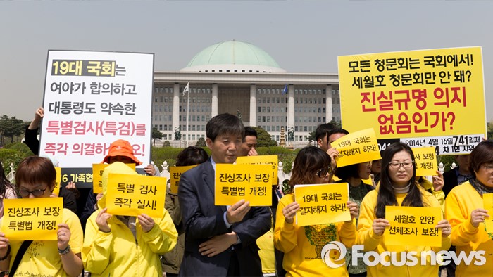 (서울=포커스뉴스) 25일 오전 서울 여의도 국회의사당 정문 앞에서 4월 16일의 약속국민연대 관계자들이 세월호 진상규명 특별법 개정 및 특검 실시 촉구 기자회견을 하고 있다.