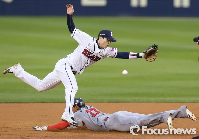 (서울=포커스뉴스) 27일 서울 잠실구장에서 열린 2016 프로야구 SK-두산 경기 1회초 2사 1루에서 SK 1루주자 이명기가 정의윤 타석때 2루 도루를 시도해 두산 포수 박세혁의 송구 실책으로 세이프되고 있다. 두산 2루수는 김동한.