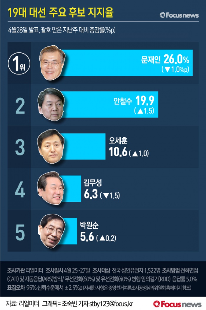 (서울=포커스뉴스) 여론조사기관 리얼미터가 25일부터 27일까지 3일간 실시, 28일 발표한 여론조사에 따르면 여야 차기 대선주자 지지도에서 문재인 더불어민주당 전 대표가 26.0%의 지지율로 1위 자리를 유지했다.