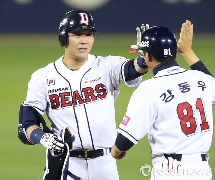(서울=포커스뉴스) 26일 서울 잠실구장에서 열린 2016 프로야구 SK-두산 경기 6회말 무사 만루에서 두산 대타 박세혁이 2타점 우익수 오른쪽에 떨어지는 2루타를 치고 2루에서 강동우 코치의 축하를 받고 있다.