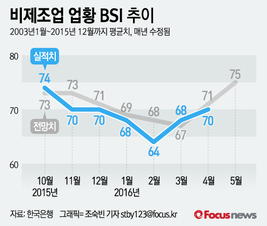 (서울=포커스뉴스) 29일 한국은행이 낸 ‘2016년 4월 기업경기실사지수(BSI) 및 경제심리지수(ESI)’에 따르면 올해 4월 비제조업의 업황 기업경기실사지수(BSI)는 전월보다 2포인트 오른 70으로 조사됐다.