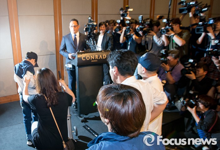 (서울=포커스뉴스) 2일 오전 서울 영등포구 콘래드호텔에서 열린 '옥시레킷벤키저(현 RB코리아) 가습기 살균제 파동' 관련 기자회견에서 아타 울라시드 사프달 옥시코리아 대표가 피해자 가족들에게 항의 받고 있다.