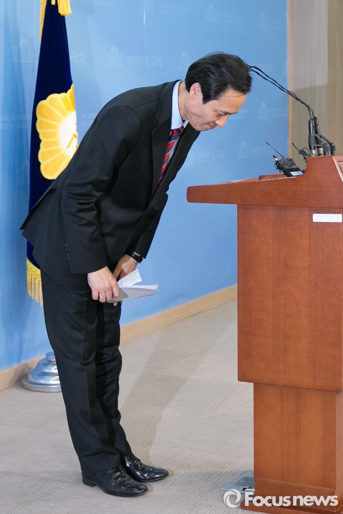 (서울=포커스뉴스) 우상호 더불어민주당 의원이 29일 오후 서울 여의도 국회 정론관에서 당 원내대표 출마 기자회견을 마친 뒤, 인사하고 있다.