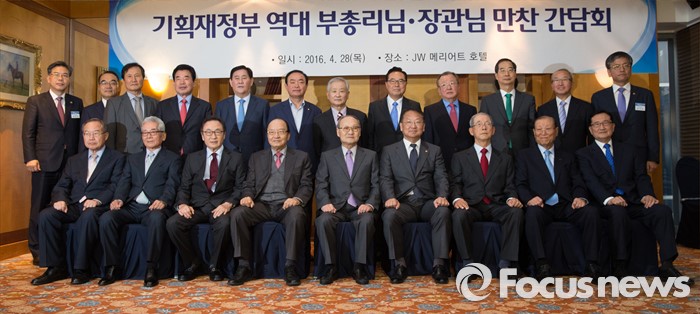 (서울=포커스뉴스) 유일호 경제부총리 겸 기획재정부 장관(앞줄 왼쪽 여섯째)이 28일 오후 서울 서초구 JW매리어트호텔에서 열린 '역대 부총리·장관 초청 간담회'에서 참석자들과 함께 기념촬영을 하고 있다.