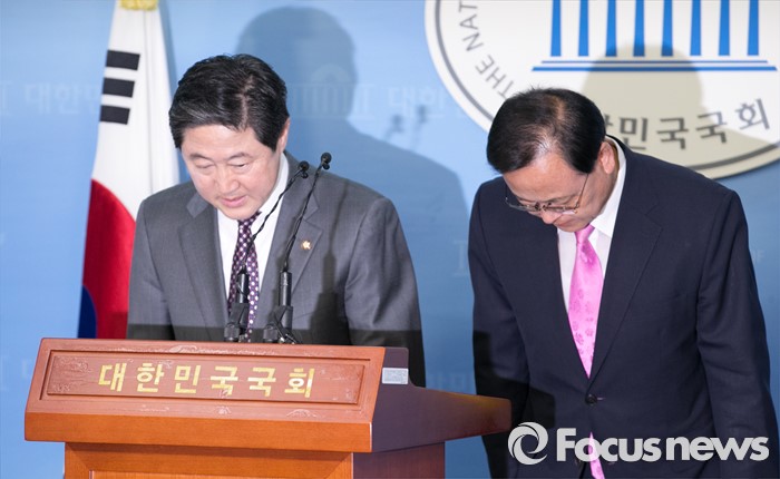 (서울=포커스뉴스) 유기준(왼쪽) 새누리당 의원이 28일 오후 서울 여의도 국회 정론관에서 정책위의장 러닝메이트 후보인 이명수 의원과 원내대표 출마 기자회견에 앞서 인사하고 있다.