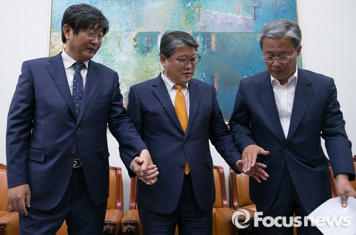 (서울=포커스뉴스) 조원진(가운데) 새누리당 원내수석부대표, 이춘석(왼쪽) 더불어민주당 원내수석부대표, 유성엽 국민의당 원내수석부대표가 27일 오후 서울 여의도 국회에서 19대 마지막 임시국회 의사일정 및 쟁점법안 등 논의를 위한 회동에 앞서 취재진을 향해 포즈를 취하고 있다.