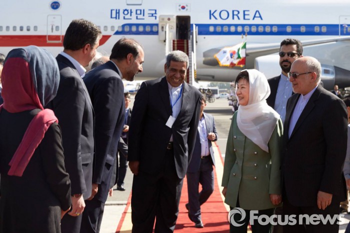 박 대통령은 1일(이하 이란 현지시간) 오후 전용기를 타고 이란 테헤란 메흐라바드 공항에 도착했다. 박 대통령은 흰색 '루사리'(여성들의 신체를 가리는 히잡 중 머리 부분만 가리는 일종의 스카프)를 착용하고 이란 정부 인사의 영접을 받았다.
