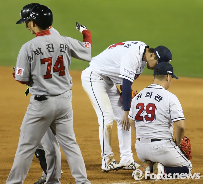 (서울=포커스뉴스) 28일 서울 잠실구장에서 열린 2016 프로야구 SK-두산 경기 7회초 1사후 SK 김민식의 1루땅볼때 두산 투수 유희관이 1루에 백업 들어왔다 볼을 놓치는 실책을 하고 무릎 꿇고 앉아 있다.