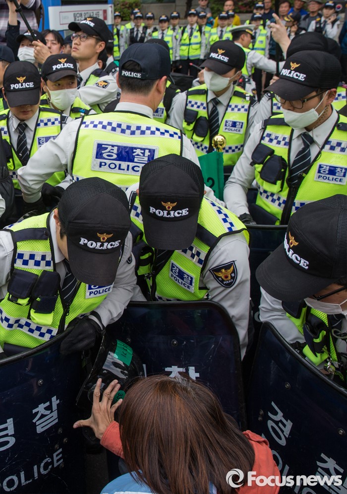 (서울=포커스뉴스) 근로자의날을 맞은 1일 오후 서울 종로구 대학로에서 민주노총 주최로 열린 '2016 세계노동절대회'에서 경찰과 420장애인차별철폐공동투쟁단원들이 충돌하고 있다.