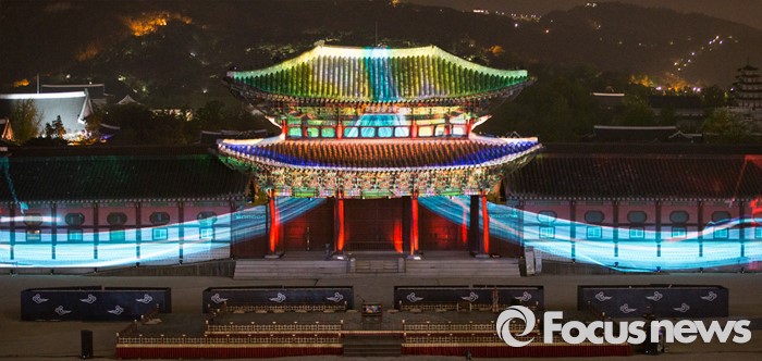(서울=포커스뉴스) 29일 저녁 서울 경복궁 흥례문 광장에서 열린 제 2회 궁중문화축전 개막제에서 경복궁의 역사를 빛으로 담아낸 '미디어 파사드' 공연이 시선을 사로잡고 있다. '오늘, 궁을 만나다'를 주제로 열리는 2016년 궁중문화축전은 다채로운 프로그램들과 함께 5월 8일까지 열린다.