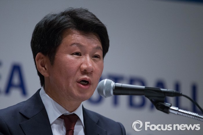 (서울=포커스뉴스) 27일 오후 서울 강남구 아이파크타워에서 열린 KFA-FIFA 기자회견에 참석한 정몽규 대한축구협회장이 취재진의 질문에 답변을 하고 있다.