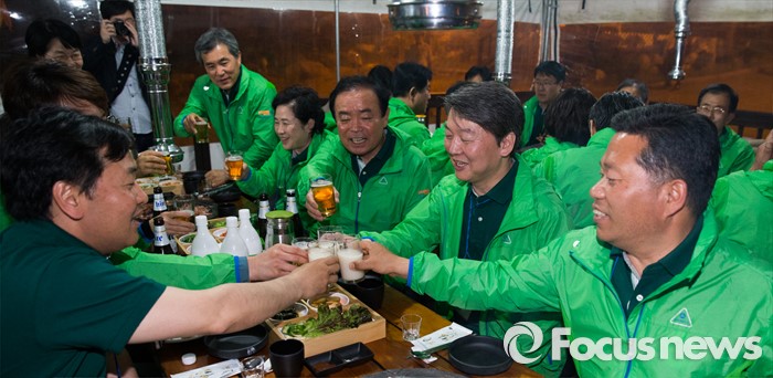 (양평=포커스뉴스) 안철수(오른쪽 두번째) 국민의당 상임공동대표를 비롯한 20대 총선 당선인들이 26일 오후 경기도 양평 한화리조트에서 열린 국민의당 20대 총선 당선자 워크숍에 참석, 저녁식사 중 건배를 하고 있다.