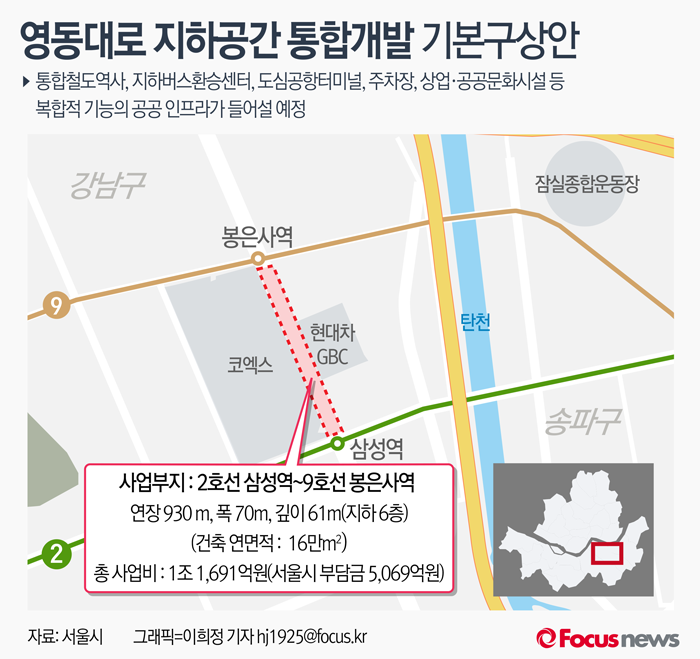 (서울=포커스뉴스) 서울시는 2일 서울시청 브리핑실에서 '영동대로 지하공간 통합개발' 기본구상 안을 발표하고, 일대의 본격적인 개발에 착수한다고 밝혔다. 대상 구간은 '지하철 2호선 삼성역~9호선 봉은사역'까지 연장 930m, 폭 70m, 깊이 51m(지하 6층)이며, 건축 연면적은 약 16만㎡에 달한다.